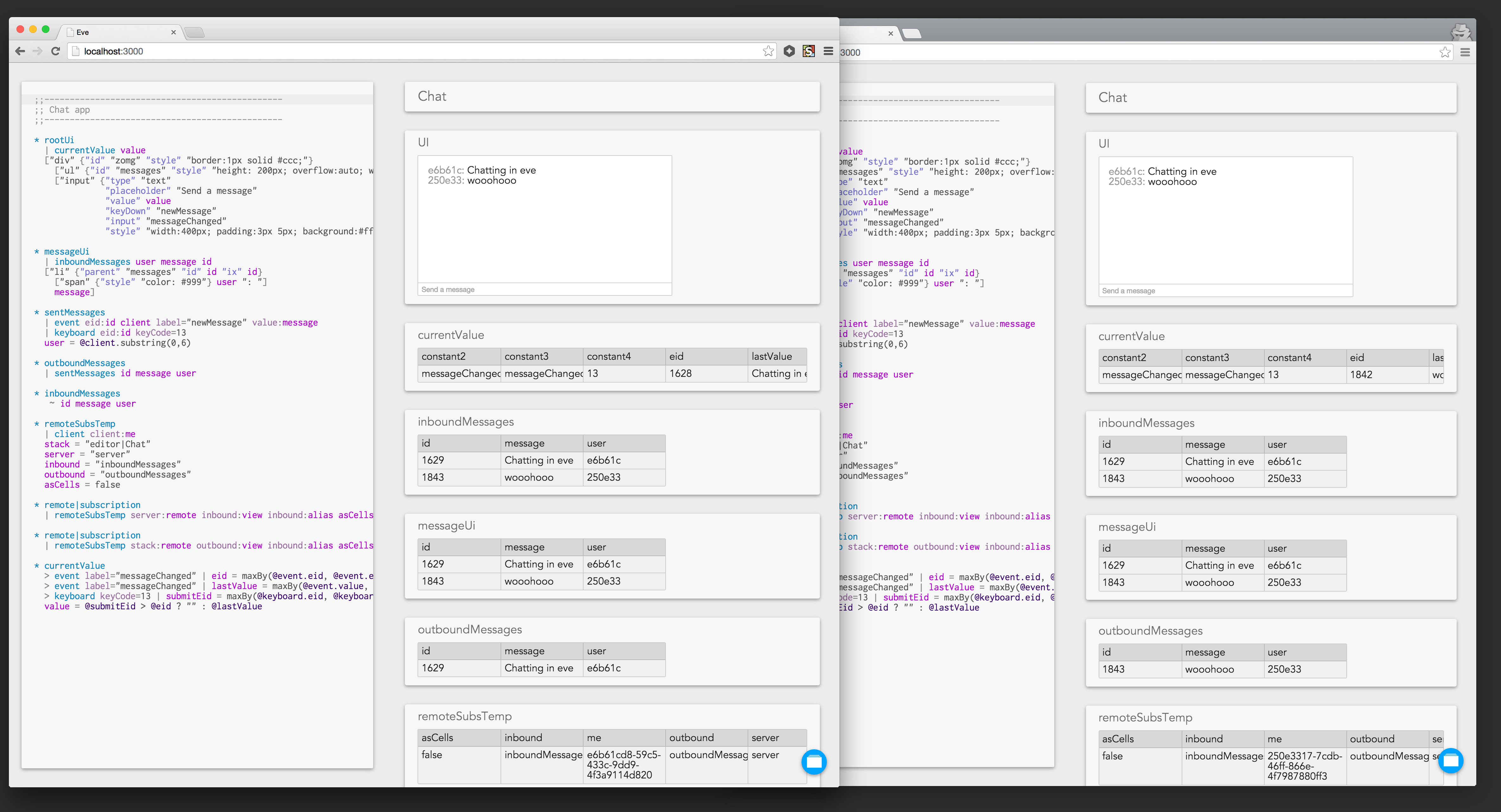 Eve processes can now communicate with each other. Unlike Bloom we don’t have a special message table for communication. Instead, processes can dynamically subscribe to views in other processes, creating a local copy which is asynchronously updated. Compared to direct messaging, this allows observation without cooperation and enables easier composition of processes.